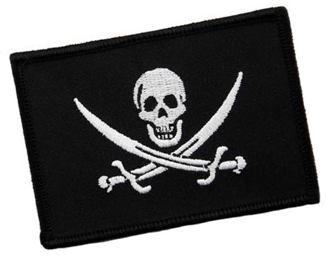 Famed pirate Calico Jack Rackham flew this version of the jolly roger flag, perhaps the most recognizable pirate flag patch we sell. Made in traditional black-and-white thread, this pirate flag patch is perfect for Halloween costumes, or even as a biker patch showing true rebel attitude. And don't forget, this skull-and-crossbones patch is also used by the famous Navy seals. Order your jolly roger patch now and get your collection started today