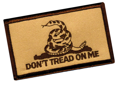 The "Don't Tread On Me" tagline is well known as a truly patriotic statement. It has a long and distinguished history and is perfectly portrayed in this desert tan Gadsden flag patch emblem. This iron-on flag applique can also be sewn on and is perfect for wearing on hats, placing on backpacks or attaching to clothing. The piece is a well-known symbol of the tea party and is impressive in its intricate stitched detail and high quality textile material construction. Get the desert tan Gadsden flag patch today.